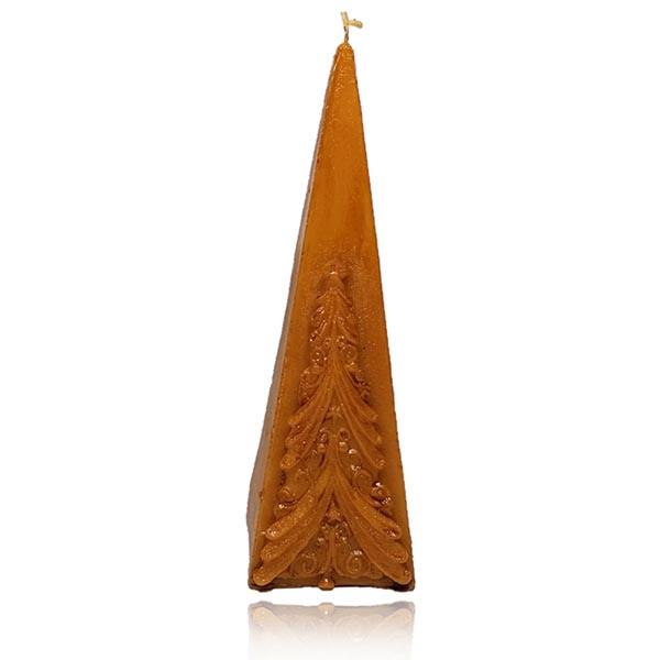 Kézzel öntött, természetes méhviasz piramis gyertya díszes fenyőfa mintával. Elegáns ünnepi dekoráció és különleges ajándék.